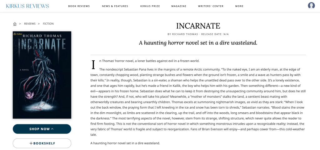 Exciting news! My first major review for Incarnate is up and it’s a great one! Over at Kirkus Reviews, they had this to say: “This is not the conventional sort of horror novel in which something monstrous intrudes upon a recognizable reality; instead, the very fabric of Thomas’ world is fragile and subject to reorganization. Fans of Brian Evenson will enjoy—and perhaps cower from—this cold-weather tale. A haunting horror novel set in a dire wasteland.”—Kirkus Reviews Click over for the full review. Out with Podium Audio in all formats on 9/10.