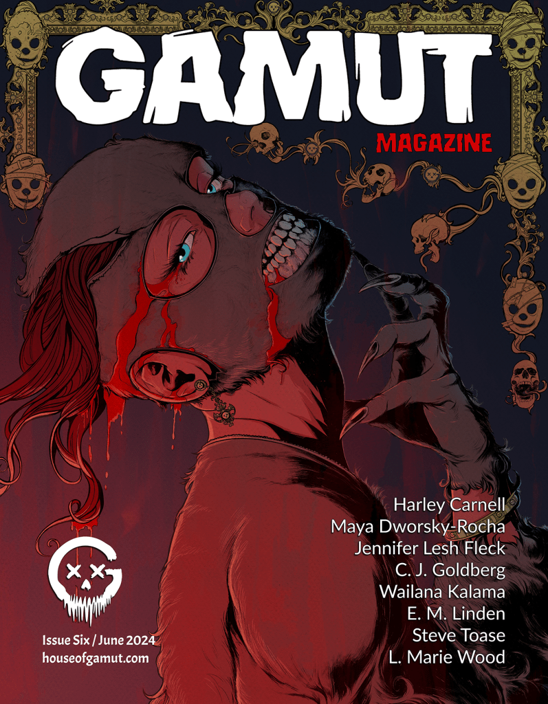 As we start to head into warmer weather with summer right around the corner, there is plenty of exciting new writing to read here at Gamut. We have three new stories in this issue: “The Lack” by C. J. Goldberg is a looping, surreal story filled with tension and the uncanny, but also a dash of hope; “Bone Deep” by Wailana Kalama shows how far two people will go in order to express their love to each other; and “Otherwise Aliyahs” is a bit of science fiction flash that will leave you unsettled, and moved. And for reprints, we three more stories: “Dancing Sober in the Dust” by Steve Toase, a favorite of mine, that disturbs as it educates, the cutting edge theater and costumes of this tale taking us down a path of suffering and expression; “Coral, Again” by E. M. Linden is a haunting story that turns a restless spirit into something else entirely; and “The Things We Burned” by Jennifer Lesh Fleck, is a spirited story of youth and friendship, and what emerges when families are broken apart, fire and destruction always a great release. Our original non-fiction essay this month is “The Marginlisation of Shirley Jackson” by Harley Carnell, which pays respects to one of the first female authors of horror, an amazing writer we still read and talk about today. And our reprint non-fiction is a powerful essay by L. Marie Woods entitled, “African American Horror Authors and Their Craft: The Evolution of Horror Fiction from African Folklore.” Our stunning artwork this month is once again by Orion Zangara. Dig in and enjoy!