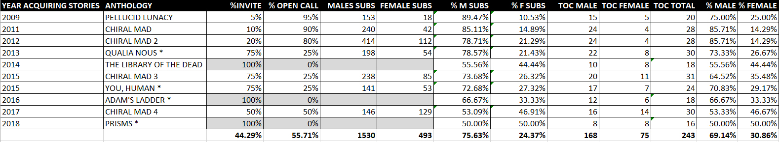 There has been a lot of discussion lately about female to male ratios within anthologies, and a lack of female presence and diversity in general. Lisa Morton, president of the Horror Writers Association, recently recapped a study from 2010 of Women in the Horror Small Press, which is around the time Written Backwards first started publishing anthologies. This got me thinking about my own projects over the years, so I put all the data I have into a spreadsheet.